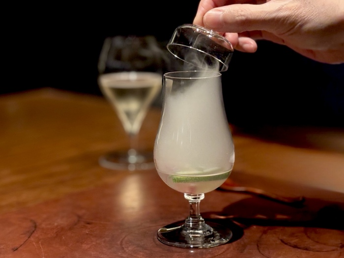 一品目は、見た目から想像がつかないお料理、蓋を開けるとふわりと漂う白い煙と共に、一口飲むとスモーキーな香りを纏う、秋刀魚とお野菜の旨みが溶け出した、秋刀魚のコンソメ,燻製香。