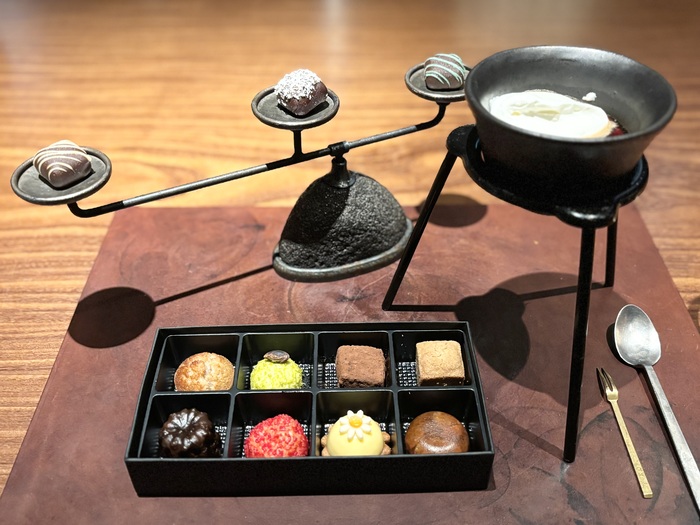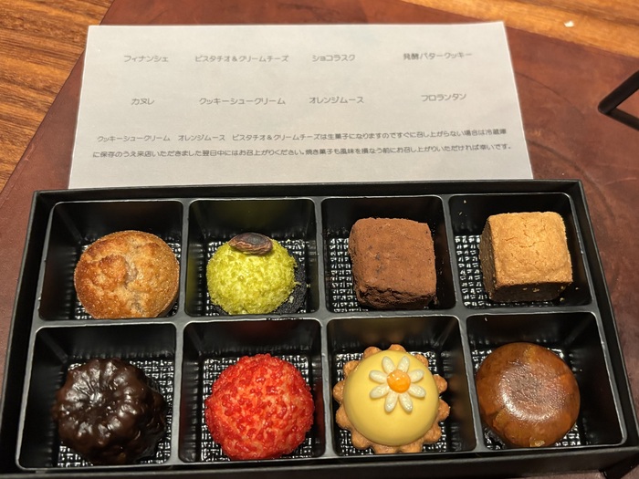 お料理の最後のデザート、ナイトアフターヌーンティー級の豪華な品数で、なんと10種類。シェフがひとつひとつ手作りしており、この日は、プリンに濃厚な味わいのチョコレート、箱入りのスイーツはその場で召し上がっても、お持ち帰りいただいてもOKです。