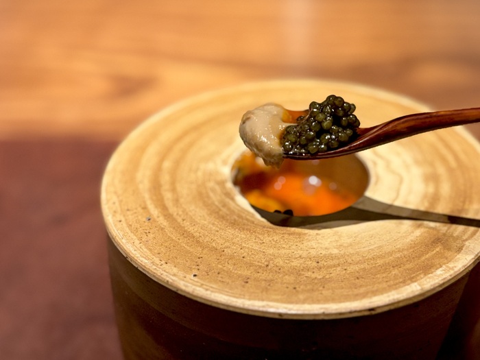 重厚感のある、丸い器の中には、濃厚な味わいの卵黄とキャビア、ねっとりとした口当たりで、カシューナッツを燻製したソースの香ばしい風味とスモーキーな香りの、龍の玉子の卵黄のコンフィ