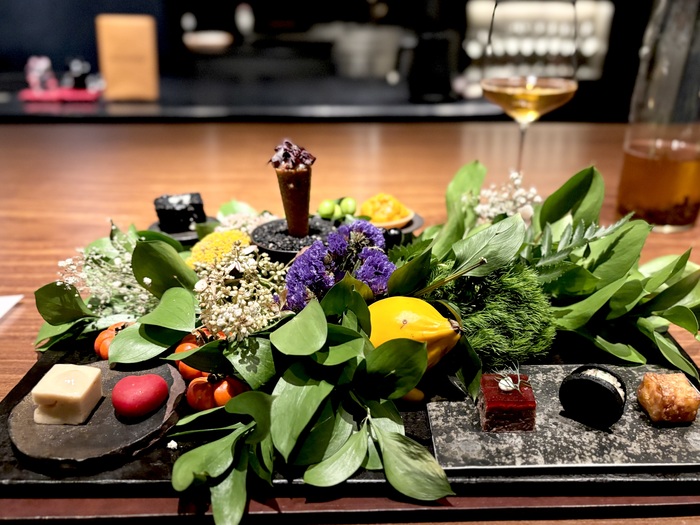 目の前に届くと、声を出さずにいられない!緑やお花で溢れるシグネチャープレート、ハート形のフルーツトマトをコーティングした一粒、オニオングラタンスープのマシュマロ、マグロのタルタル、エスカルゴバターを挟んだクッキーサンドなど、ひと粒ひと粒がお料理として構成されています。