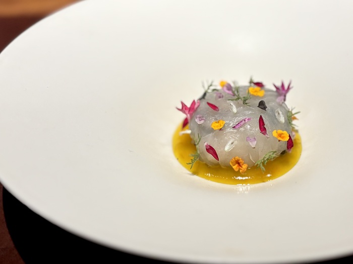 色鮮やかなお花が散らされ、可愛らしいフォルムの明石の鯛とホタテと白エビとキャビアのタルタル、魚介のソースにサフランの風味が加わり豊な味わい、お料理ごとにワインとティーペアリングをオーダーできるので、アルコール、ノンアルコールでもお料理に合わせてお楽しみいただけます。