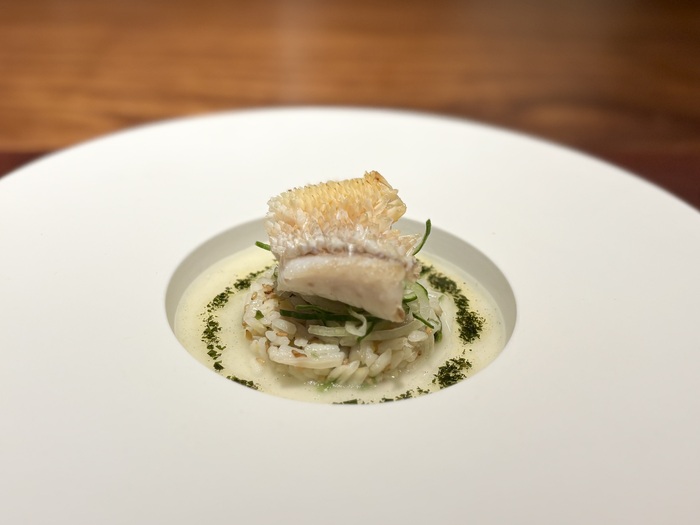 真っ白な器に、秋の知らせを感じる甘鯛の鱗焼きお米のサラダ、キュウリのソース、サクサクと軽い食感と香ばしい風味の鱗とふっくらとした甘鯛、さっぱりとしたキュウリとお米の甘さ、一皿いただくごとに、想像を超える初めてのお料理にワクワクが尽きません。