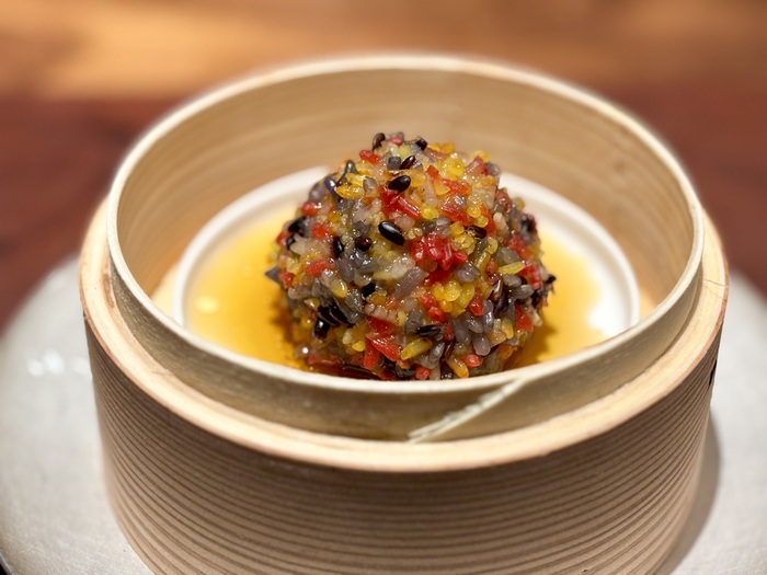 セイロを開けると、カラフルなお米で覆われたもち米シュウマイフォアグラとトリュフ,イベリコ豚、一年かけて作られた自家製の鶏のお醤油をかけていただきます。ジューシーな旨みと芳醇な香りが口の中いっぱいに広がります。