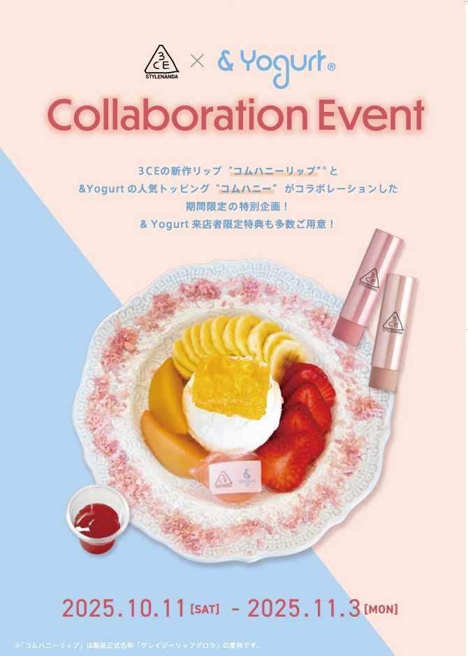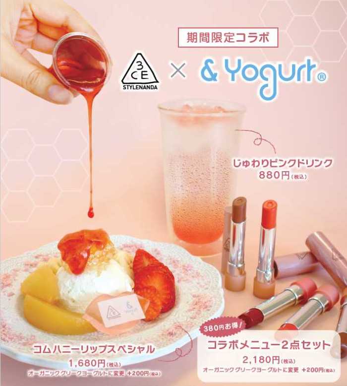 発売記念として、&Yogurtとのコラボメニューも登場♡「コムハニーリップスペシャル(税込1,680円)」や「じゅわりピンクドリンク(税込880円)」を表参道・横浜店で期間限定販売(10/11~11/3)。