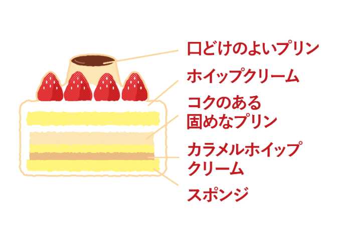 カラメルホイップクリームとふわふわスポンジが絶妙に重なり合い、プリンとケーキの贅沢なハーモニーを楽しめます。お子さまから大人まで笑顔になれる特別なケーキです。