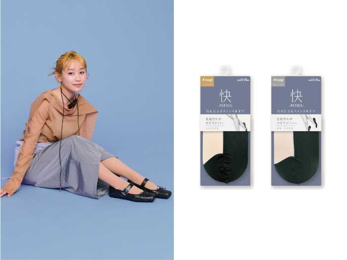 ソックス【爽】は綿混素材でサラッとした履き心地、全6色展開で価格は550円~660円(税込)。さらに【快】は靴との摩擦でストッキングが黒ずむ悩みを解消し、自然な素肌感を演出してくれるタイプ。