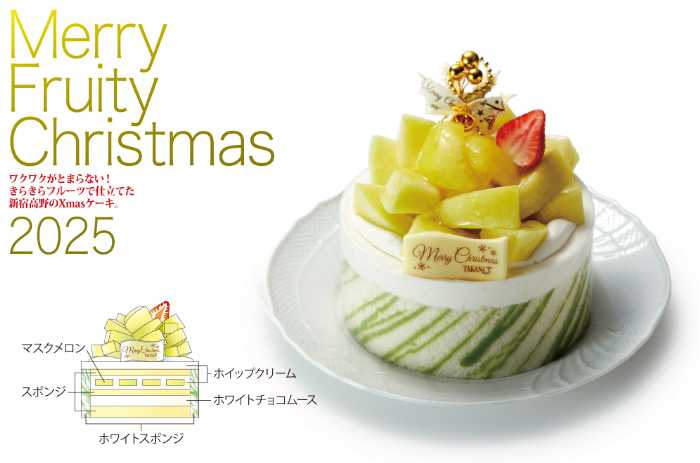 新宿高野の「2025 Takano’s Christmas」には、特別感あふれるケーキが勢ぞろい。それぞれのケーキはフルーツの魅力を最大限に引き出し、見た目も味も心華やぐ仕上がりです。