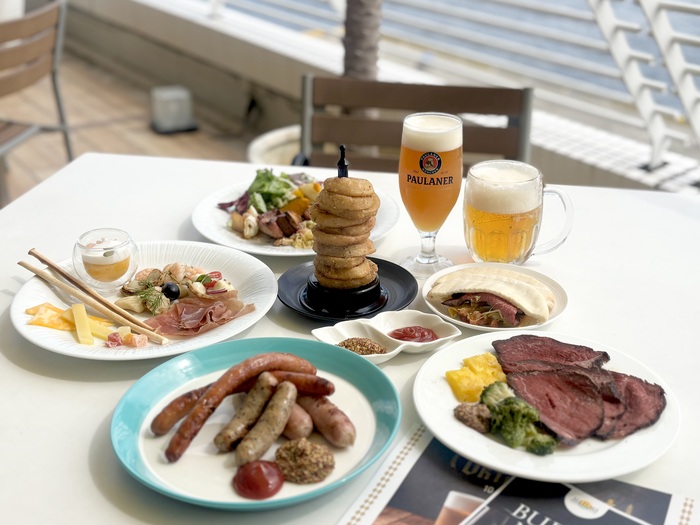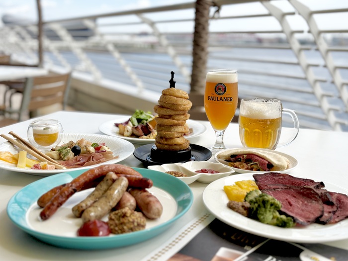 テラスにはライブキッチンが設置され、ビールに合う5種類のソーセージをシェフがグリルで焼きたて提供。オニオンリングタワー(1テーブルに1セット)も付いており、海の風を感じながら楽しめます。