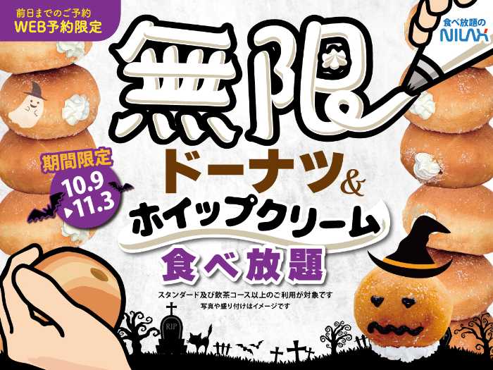 “好きなだけホイップクリームを楽しみたい♡”そんな甘党女子に朗報です。全国のニラックスブッフェ店舗にて、2025年10月9日(木)~11月3日(月)までの期間限定で「無限ドーナツ&ホイップクリーム食べ放題」コースが登場!カリもち食感のドーナツに、自分でホイップをトッピングするセルフメイクスタイル。ハロウィン気分も楽しめる、特別なスイーツタイムを満喫してみませんか?