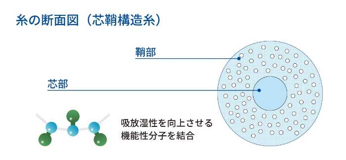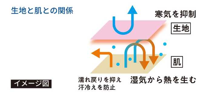 「ファイヤーアセドロン」は、吸湿発熱機能と吸放湿機能を兼ね備えたグンゼ独自素材を採用。汗を吸っても濡れ戻りを抑え、ムレを防いで衣服内を快適に保ちます。