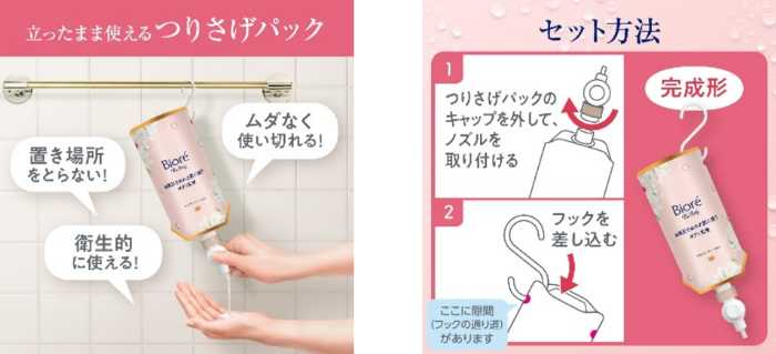 新発売の『ビオレ ザ ボディ お風呂でぬれた肌に使うボディ乳液』は、便利な“つりさげパック”容器を採用。浴室内で手軽に使えるように設計されており、パックをそのまま吊るして使用できます。