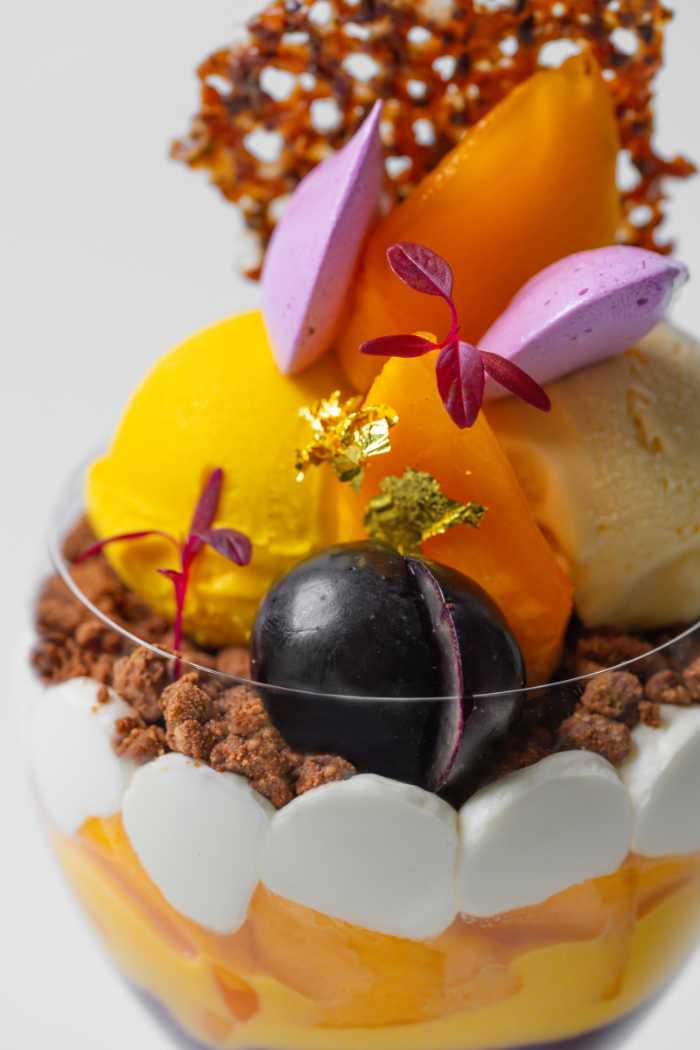 トップにはカカオのほろ苦さをまとったチュイールと軽やかなカシスメレンゲ。フレッシュな長野パープルと柿の果実に、カボチャジェラートとラム香るジェラートを重ね、豊かな味わいを演出します。