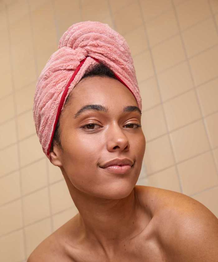 リサイクルポリエステルを使用した立体ジャガード織りで、ふわふわの触り心地。赤とピンクのバイカラーが可愛く、ヘアケアの時間が一気にテンションアップ♡