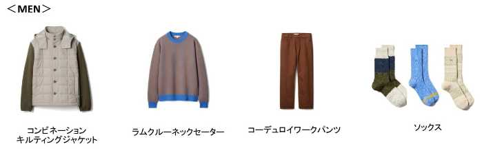 メンズではワイドテーパードのコーデュロイパンツも登場し、フロントポケットやワークテイストのアクセントが効いています。