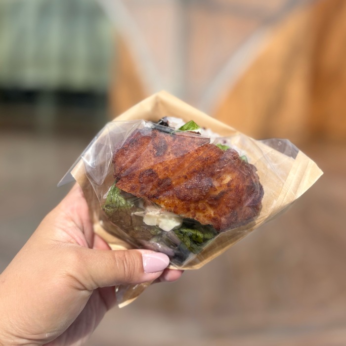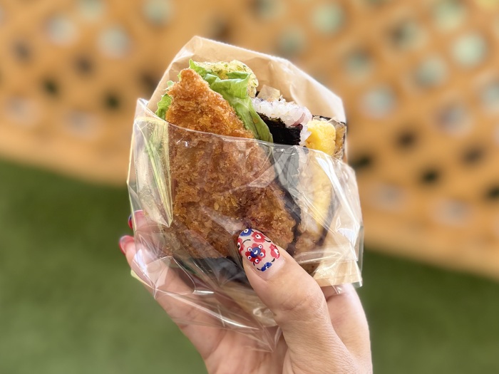白身フライとちくわ磯部を十六穀米でサンドし、磯の香り豊かな海苔で包み込んだ片手サイズの手持ちグルメ。大屋根リングやお気に入りのスポットで、思わず写真を撮りたくなる一品です。