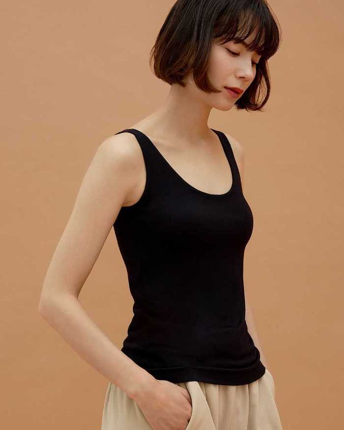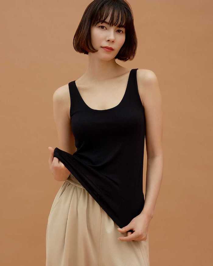クルーネックロングは首元まで温め、8分袖で重ね着しても着膨れせずすっきり。タンクトップは腕周りを涼しく保ち、ロングシーズン活躍します。