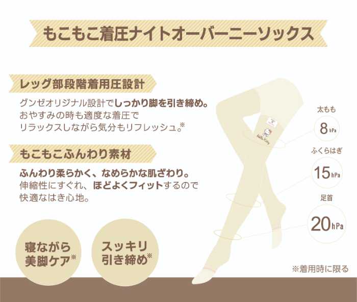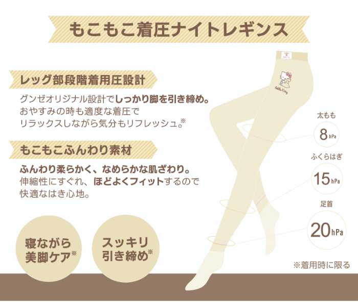 ハローキティは優しいアイボリー、ポチャッコはミントグリーンで登場♡就寝時も心地よく脚を引き締めるグンゼオリジナル設計。