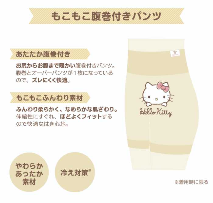 腹巻付きパンツは、お尻からお腹まで包み込み、冷え対策としても◎。ハローキティとポチャッコを編み柄で表現し、ふんわり素材が快適な履き心地を実現。