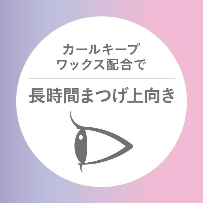 さらにカールキープワックス配合で、ビューラーしたての上向きまつげを長時間キープ。まつげケア成分としてヒアルロン酸Naや加水分解コラーゲンも配合し、塗るたびうるおいを与えます。