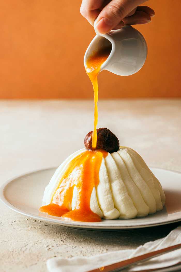 「スフレモンブラン 自家製完熟柿のソース」は、FLIPPER’S自慢のスフレパンケーキを秋の味覚モンブラン仕立てにアレンジした限定メニュー。