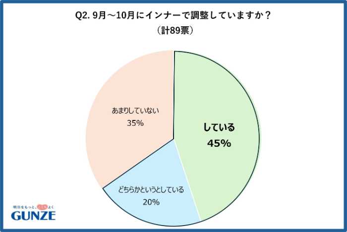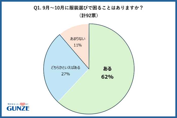 グンゼの公式Xで行われたアンケートでは、約9割の人が9〜10月の服装選びに悩むと回答。