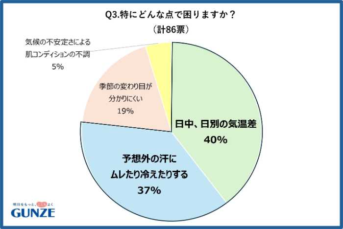 そのうち65%が「インナーで温度調整している」と答えました。特に多かった悩みは、「気温差」と「汗によるムレ・冷え」。