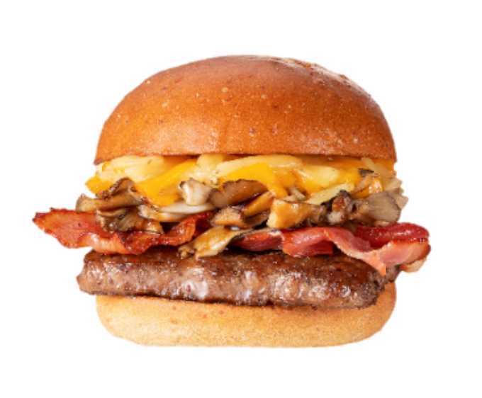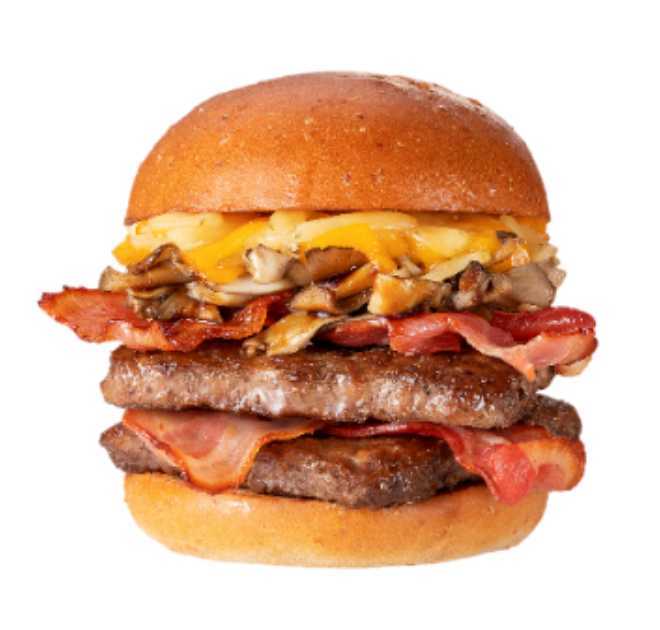 ウェンディーズ自慢の100%ビーフパティを2枚重ね、アップルウッドで燻製したベーコンが香ばしく食欲をそそります。とろける3種のチーズと、ジューシーなお肉、舞茸の食感が織りなす贅沢なハーモニー。