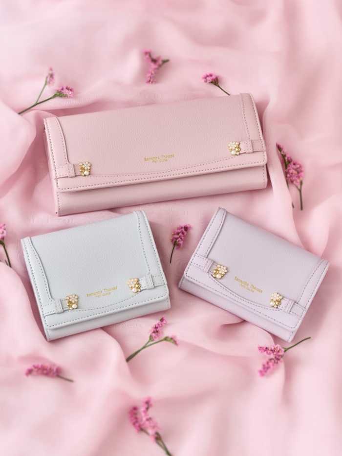 お花やハート、パールを組み合わせたモチーフがベルト部分にあしらわれ、まるでアクセサリーのような華やかさ。優しいパステルカラーが秋の装いに映えるデザインです。