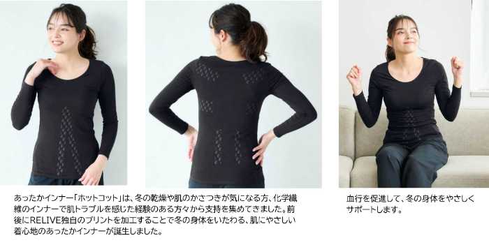 「ホットコット」のやさしさと「リライブ」のサポート力が出会って生まれた、“着るだけで整う”新しいあたたかさです。