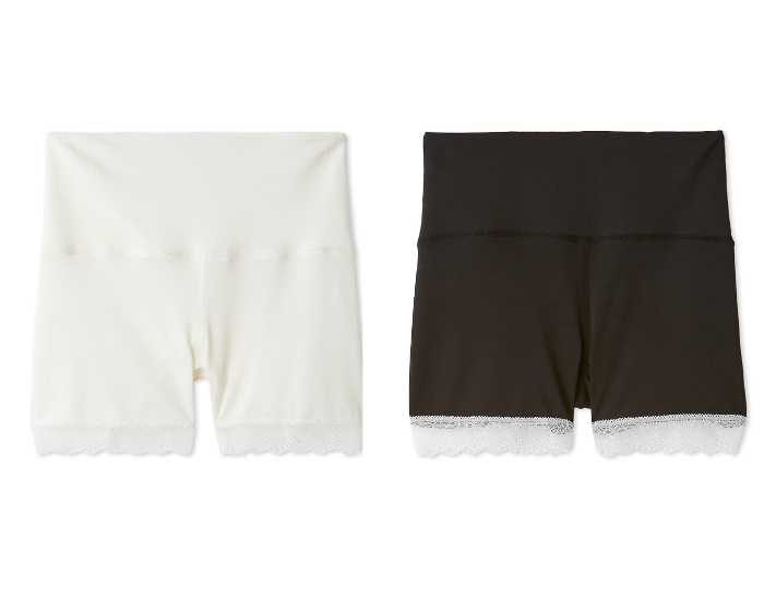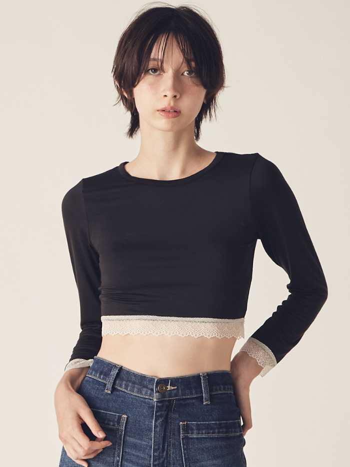 ウエスト部分にレースをあしらったクルーネックタイプは、クロップド丈のトップスとも好相性。袖丈を少し短めに設計することで、洋服から見えにくい工夫もされています。