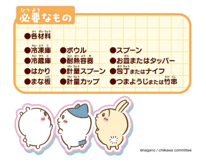 食材は別途用意が必要ですが、作り方はシンプルなので子どもとも一緒に楽しめます。おうちで「ちいかわ」たちと過ごすスイーツタイムで、秋の午後をもっと甘く、もっと楽しく♡