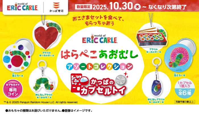 かっぱ寿司に、世界中で愛される絵本「はらぺこあおむし」のカプセルトイが登場♡全6種のオリジナルアイテムはアクリルキーホルダーや缶ミラーなど、お子さまから大人まで楽しめるデザイン。店内で「おこさまメニュー」や「カプセルトイコイン」を注文すると、専用コインで回してゲットできます♪2025年10月30日(木)~なくなり次第終了の限定企画です。