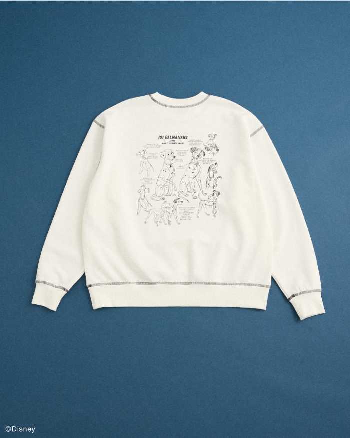 バックプリントスウェット(White 4,990円)にはポンゴとパディータ、15匹の子犬たちが描かれています。
