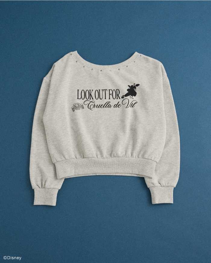 クルエラオフショルスウェット(Gray mix 5,990円)は、毛皮好きの悪女キャラクターをモチーフに♡