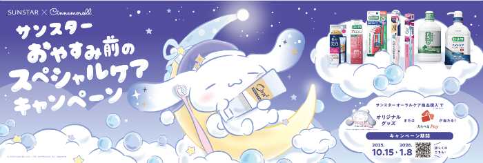 サンスターの「おやすみ前のスペシャルケアキャンペーン」で、夜のオーラルケア時間をもっと楽しく♪人気キャラクター・シナモロールとのコラボグッズや、「えらべるPay®」が抽選で当たるチャンスです。