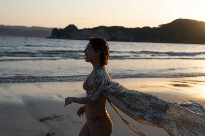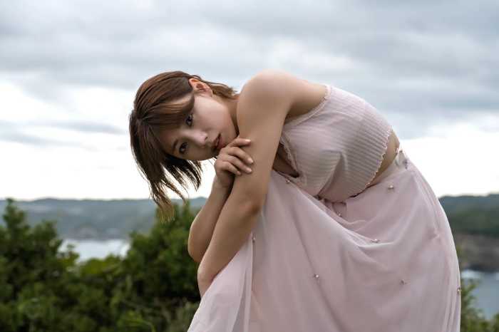 穏やかな風に吹かれながらピンクのスカートをなびかせるシーンや、夕陽に照らされるシネマティックなビーチシーンなど、彼女の魅力が余すことなく表現されています。