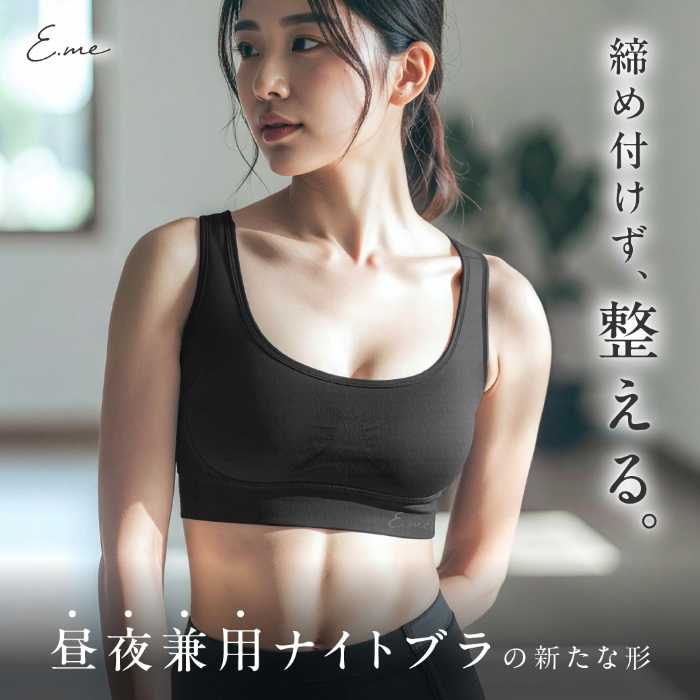 E.meのナイトブラは、今までの「盛る」ためのブラジャーとは一線を画します。ナイトブラとしてバストを整え、横流れを防ぎつつ、下からふんわり持ち上げる立体設計で自然な形に導きます。