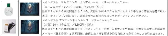 悟空のきもちと共同開発した“睡眠空間”のための香り「ドリームキャッチャー」。ノンアルコールフレグランスとお香のセットで、穏やかな夜のリラックスタイムにぴったりです。