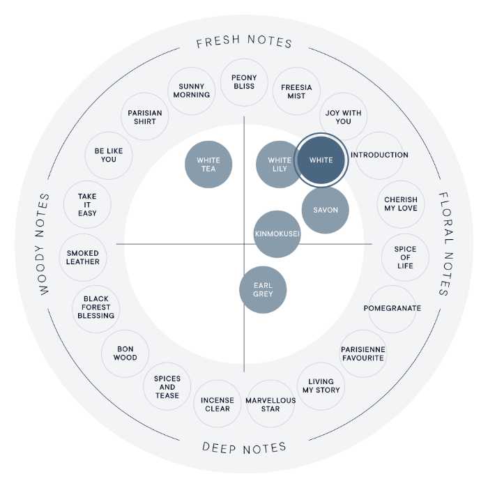 2021年に限定発売され、ファンの心を掴んだ「ホワイト」が数量限定で再登場します。みずみずしいアップルやベルガモットから始まり、ジャスミンやスズラン、ホワイトリリーが可憐に咲くミドルノートへ。