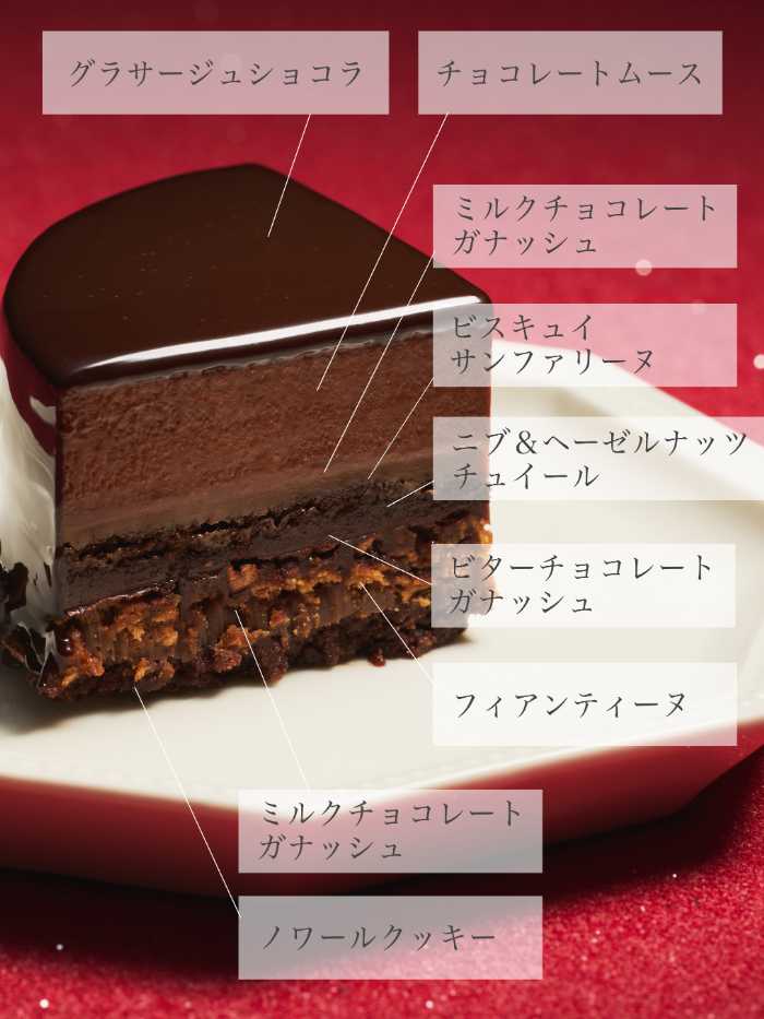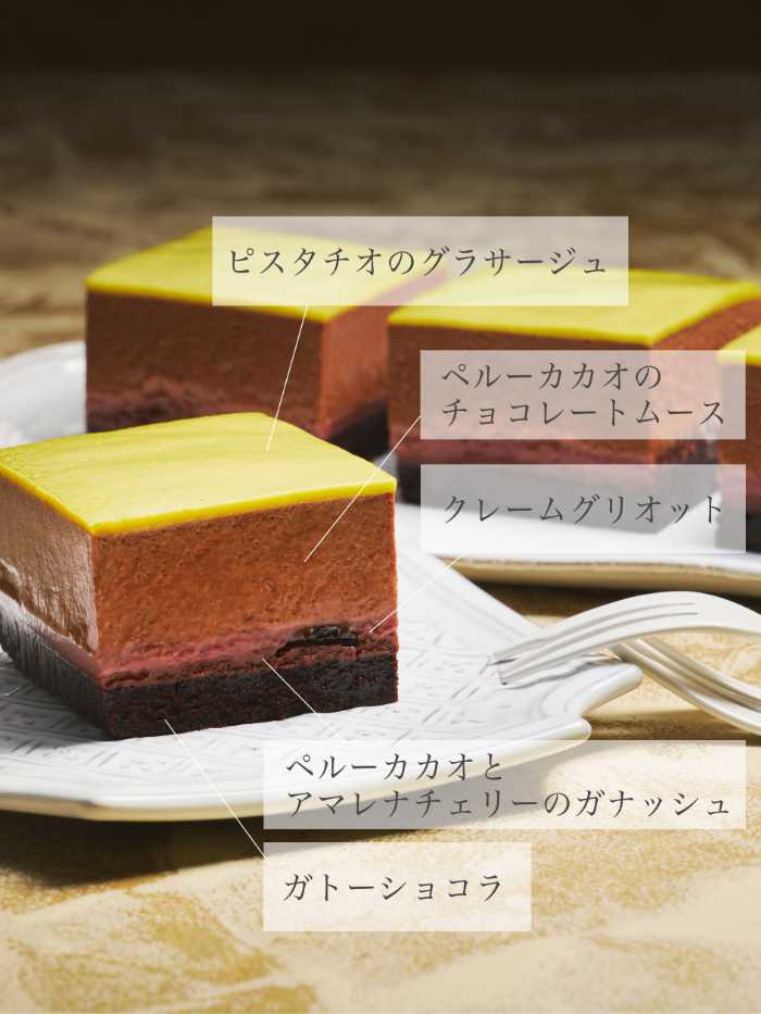 上からピスタチオのグラサージュ、ペルーカカオのチョコレートムース、クレームグリオット、ペルーカカオとアマレナチェリーのガナッシュ、ガトーショコラの5層構造です。