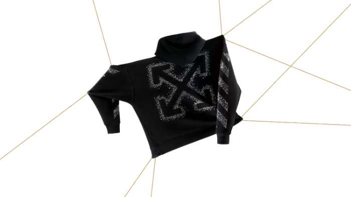 Off-White™フーディは4,025粒のクリスタルで星空のような輝きを実現。多彩なサイズのパヴェ・ジュエリー技法で、ブランドの個性とクラフツマンシップが光ります。