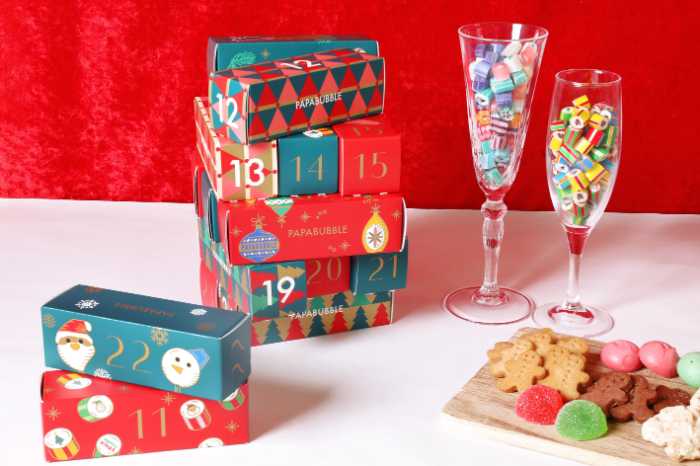 「パパブブレのアドベントカレンダー」(税込 5,800円)は、12月10日から15日間楽しめる仕様。キャンディ・グミ・焼き菓子などが日替わりで楽しめ、最後に限定チャームが出てくるサプライズも。