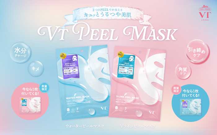 VT COSMETICSの新作ピールマスクは、肌悩みに合わせて「引き締めケア」と「水光ケア」を選べる画期的なアイテム。数量限定のおまけ付きでさらにお得に手に入るチャンス!