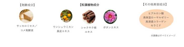 保湿成分サッカロミセス/コメ発酵液※4、ウンシュウミカン果皮エキスやシャクヤク根エキス、ボタンエキス※5の和漢植物、ヒアルロン酸Naや加水分解ローヤルゼリーエキス※6などを配合。