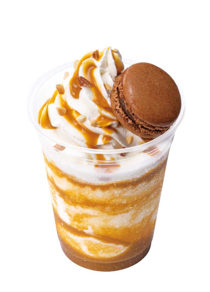 「~ショコラマカロン付き~ 塩キャラメルパフェシェーキ」は、ミルクベースのシェーキに塩キャラメルソースを合わせ、ホイップクリーム・クラッシュナッツ・ショコラマカロンをトッピング♡