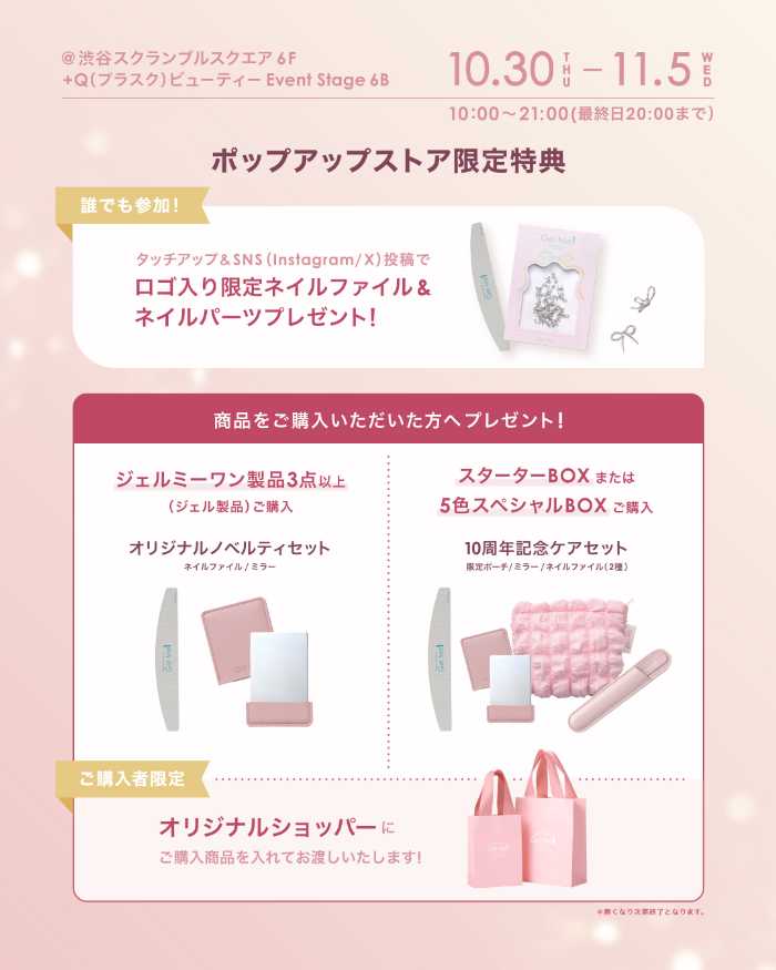 セルフネイルブランド『ジェルミーワン』が10周年のフィナーレを飾るPOPUPを渋谷で開催。テーマは「Let the joy find you」──喜びはふとした瞬間に訪れるもの♡冬限定カラーやスペシャルボックス、初のマグネットポリッシュのお披露目など、特別感満載のイベントです。ネイル好きはもちろん、これからセルフネイルを始めたい方も必見の内容になっています♪