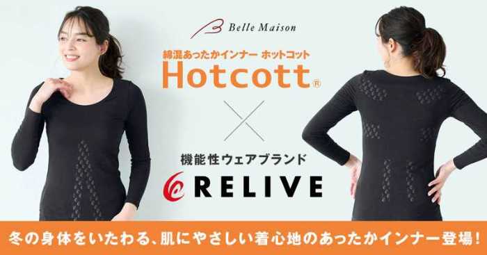 「【リライブコラボ】綿混あったかインナー・クルーネック長袖レディース」は、ベルメゾンの人気インナー「ホットコット」に、株式会社りらいぶの血行促進技術「リライブ加工」を組み合わせた一品。