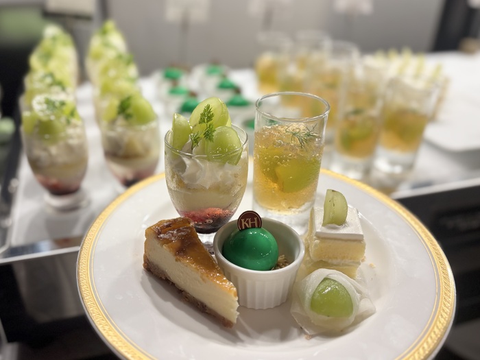 みずみずしいシャインマスカットをたっぷりと使用したスイーツがたくさん!「シャインマスカットのミニパフェ」に「シャインマスカットショートケーキ」や「シャインマスカット大福」に「シャインマスカットとアールグレイのジュレ」など、華やかなスイーツはどちらも食べ放題、そして時間制限なし!!