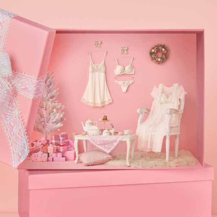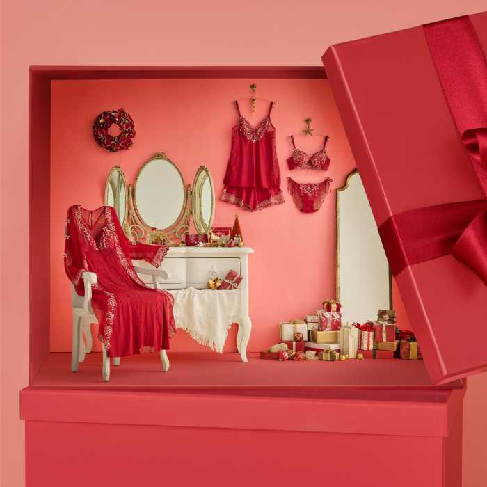 それぞれにワイヤーブラ、ノンワイヤーブラ、ショーツ、スリップ、カーディガンなど多彩なアイテムが揃い、ホリデーシーズンを華やかに彩ります。