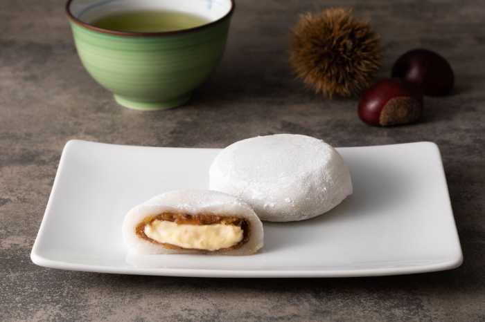 富山県産の新大正もち米を使った柔らかい求肥に、栗の風味が豊かな栗あんと、なめらかなカスタードクリームが包まれています。